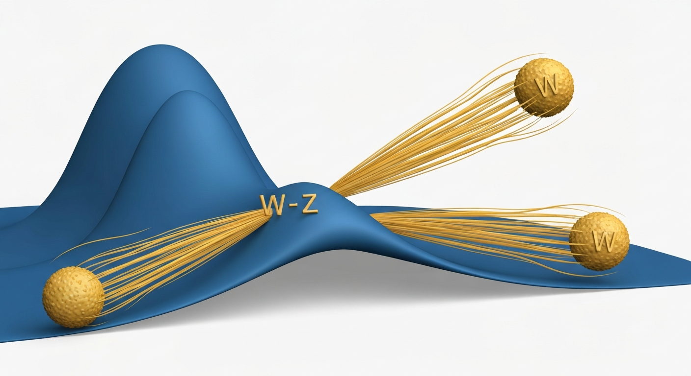 Polar reading of \(v = \mathcal{M}^6/(3\pi^2)\): On the polar rectangle, the VEV is the 6D Planck scale reduced by two filters. The THROUGH filter (\(1/\langle u^2\rangle = 3\)) measures how much of the \(u\)-direction polynomial structure contributes to the gauge-Higgs overlap — the linear monopole harmonic \((1+u)/(4\pi)\) only samples \(1/3\) of the \(u^2\)-variance. The AROUND filter (\(\pi^2\)) measures how the azimuthal wavefunction spreading dilutes the interaction. These are the same two geometric mechanisms — polynomial overlap and azimuthal dilution — that control every derived coupling in the theory. The transmission coefficient \(\tau = 1/(3\pi^2) \approx 1/30\) is the fraction of the 6D scale that survives both filters to become the 4D electroweak VEV.